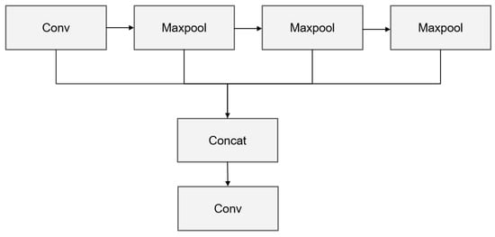 SPPF is aimed at enhancing the speed and efficiency of the model when processing inputs of different dimensions. It achieves this by performing regional pooling operations at multiple scales, ensuring that input images of diverse sizes can produce output feature maps of uniform dimensions. The primary mechanism involves integrating features across different hierarchical levels through pooling operations, thereby enhancing the model’s versatility and processing speed.The network architecture of SPPF is shown in Figure 2.