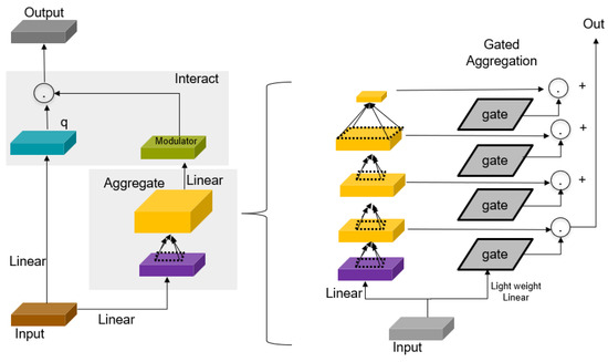 In the FocalNet architecture, Equation (4) employs a hierarchical contextualization method, where represents the feature map of the ℓ layer, obtained by processing the feature map of the -th layer through depthwise separable convolution and the non-linear activation function GELU. This method combines depthwise separable convolution with the non-linear activation function GELU to recursively extract and modulate feature maps, capturing contextual information across multiple scales. This process not only enhances the model’s understanding of image details and structural information but also optimizes computational efficiency. Subsequently, Equation (5) introduces a gated aggregation mechanism, where denotes the final output feature map, obtained by performing a weighted summation of feature maps from all levels. The weighted summation is conducted through gating weights , which determine the contribution of each level’s feature map in the final output. This mechanism effectively integrates contextual information from local to global by applying spatially aware gating weights to the feature maps of different hierarchies [17]. This aggregation strategy enables the model to maintain fine details while also capturing broader contextual relationships, thereby enhancing the richness and flexibility of feature representation.