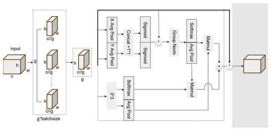 One notable feature of the EMA module is the reorganization of the input feature’s channel dimension. Specifically, the module reshapes some of the input feature channels into the batch dimension, thereby forming multiple sub-feature groups. This reorganization strategy not only effectively preserves the original information of each channel but also significantly reduces computational complexity, thereby improving the model’s operational efficiency [18]. This innovative method of dimensional reorganization provides a solid foundation for subsequent feature extraction and optimization.