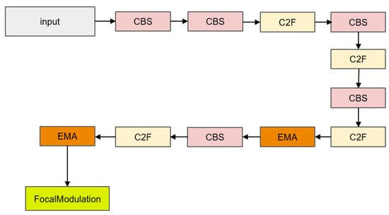 In comparison, focal modulation (as shown in Equation (2)) employs an innovative early aggregation approach, with the specific implementation detailed in Equation (3). Here, represents the i-th output feature vector, q denotes the query function, m signifies the modulation function, and i is the positional index of the feature. Feature representations are generated through query projection and context modulation specific to the feature’s location [16]. The advantage of focal modulation lies in its translation invariance, sensitivity to input, and specific modulation in spatial and channel dimensions, while effectively separating and combining fine-grained features with contextual information. This approach not only enhances computational efficiency but also enriches the representation of features, providing new research directions and practical guidance for feature encoding in the field of computer vision.