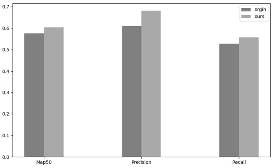 The experiment initially assessed the impact of incorporating the EMA attention mechanism and substituting the SPPF module with focal modulation on the performance of the YOLOv8 model for target detection (see Figure 7 for the comparison of original and our data). The baseline model, without modifications, achieved an accuracy of 0.61, a recall rate of 0.528, and an mAP50 of 0.576. In the experiment where SPPF was replaced with focal modulation, accuracy increased to 0.627, although recall slightly decreased to 0.523, with mAP50 remaining at 0.577. When SPPF was replaced with focal modulation and EMA was added to the head part, precision dropped to 0.594, while recall slightly increased to 0.529, and mAP50 decreased to 0.559. Concurrently replacing SPPF with focal modulation and adding EMA to both the backbone and head parts led to a slight increase in precision to 0.616, with recall at 0.551 and mAP50 at 0.570. Furthermore, substituting SPPF with focal modulation and inserting the EMA module into the backbone resulted in a significant enhancement in accuracy to 0.681, with corresponding improvements in recall rate and mAP50 to 0.557 and 0.604, respectively.