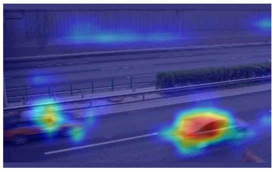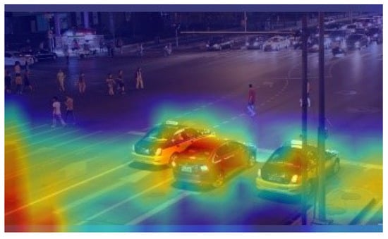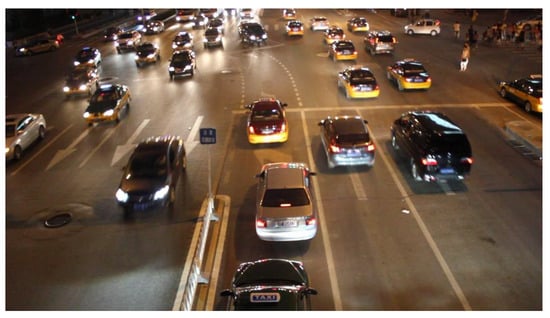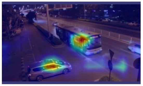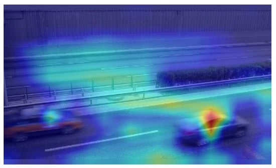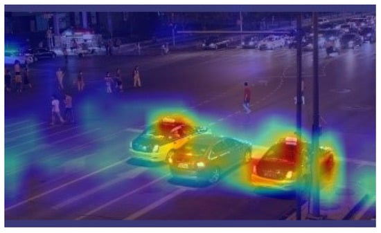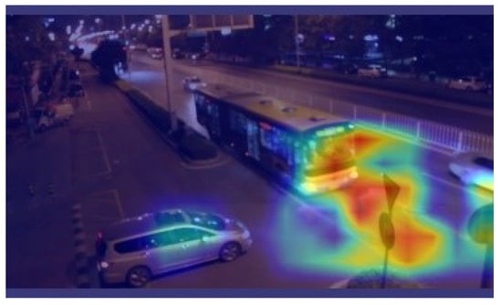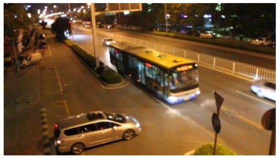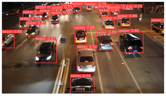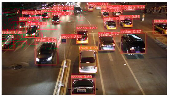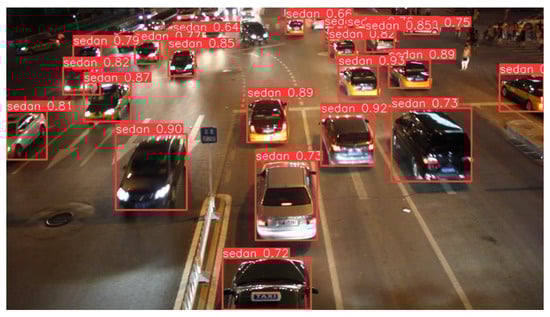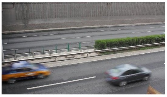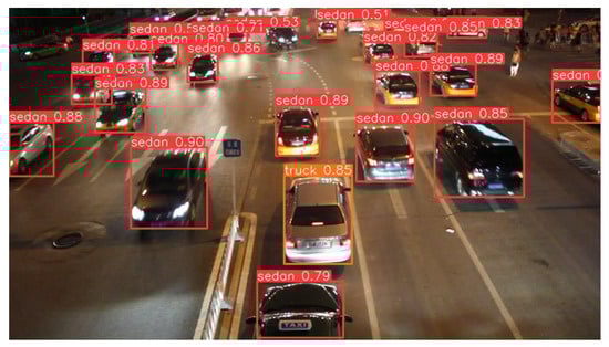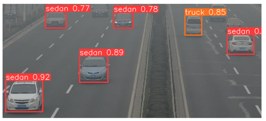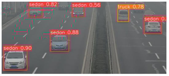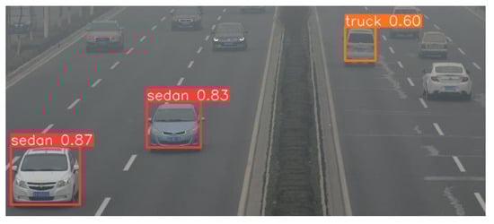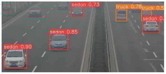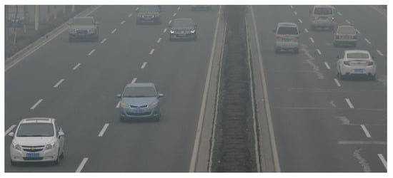 In assessing the impact of these scenarios, various indicators can be quantified to evaluate the influence of each condition on model performance. For instance, congestion levels can be assessed through vehicle density, speed, and lane occupancy rates, which directly affect traffic flow and detection accuracy. As shown in the congestion scene (Figure 11), dense traffic conditions make vehicle detection more challenging due to the overlap and occlusion between vehicles. Nighttime scenarios can be evaluated based on light intensity, uniformity, and the type of light sources to ensure the model remains effective in low-light conditions. The nighttime scene (Figure 12) demonstrates how reduced visibility and uneven lighting impact detection performance. The influence of rain can be measured through raindrop density, road slickness, and glare reflection, which increase visual complexity and challenge the model’s detection capabilities. In the rainy scene (Figure 13), the rain affects the image quality through glare and reflection, making vehicle detection harder. Finally, haze conditions can be evaluated based on particulate concentration, visibility, and color distortion, placing higher demands on the reliability of computer vision algorithms. The haze scene (Figure 14) illustrates the reduced visibility and color distortion caused by particulate matter, which further complicates detection.