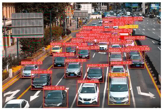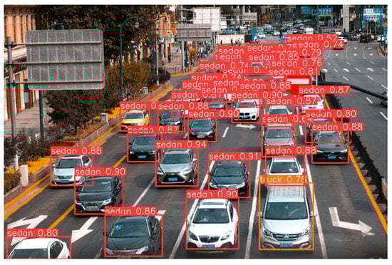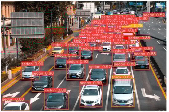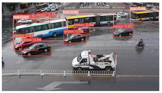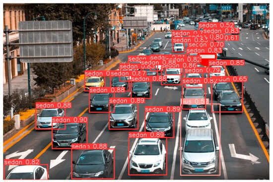 In congested scenarios, where complex and dense traffic flows are present, the original model (Figure 15) faced challenges with false positives and missed detections, which impacted both the accuracy and completeness of the detection. Through targeted improvements, especially optimizations for handling increased traffic volume and complexity, the enhanced model (Figure 16) significantly improved detection performance, reducing both false positives and missed detections. However, in typical congested scenarios, EfficientDet (Figure 17) outperformed our improved model, and Rank-DETR (Figure 18) demonstrated superior performance overall. Rank-DETR showed particular advantages in managing complex traffic flows, thanks to its sorting mechanism and better handling of occlusions between vehicles.