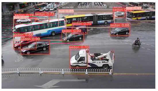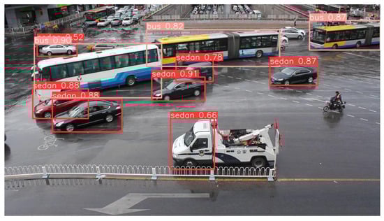 Similarly, in rainy conditions, the original model (Figure 23) faced challenges with false detections due to rain, causing interference in vehicle detection. The improved model (Figure 24) addressed these issues by conducting a more detailed analysis and processing of image data affected by rain, significantly enhancing vehicle detection capabilities under adverse weather conditions. However, the performance of both EfficientDet (Figure 25) and Rank-DETR (Figure 26) was also limited and did not reach the level of our improved model. Despite these optimizations, some misdetections still occurred under rainy conditions, highlighting the need for further improvements. Factors such as raindrop interference, reflections and glare, background clutter, and variations in ambient light continue to affect the model’s performance. This underscores the importance of continued research to ensure the model’s accuracy and reliability in complex and challenging weather conditions.