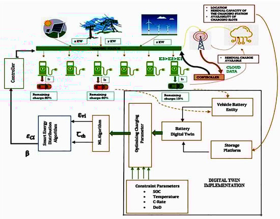 The initial part deals with leveraging the pivotal role of BDT technology in modeling electric vehicle (EV) batteries. In the context of EV batteries, BDTs empower researchers to model battery behavior under diverse operational conditions and loads, enabling performance prediction and early issue-identification. This knowledge, in turn, aids in the optimization of battery management systems, enhancing battery performance, and extending battery lifespan. BDTs also enable the assessment of the impact of factors like temperature on battery performance and the optimization of battery designs for specific applications. The incorporation of advanced visualization tools and machine learning algorithms provides further insights into battery behavior, allowing for continual enhancement of the digital twin. The second section delves into the proposed algorithm, which is designed to allocate charging nodes and intelligently distribute energy based on the energy availability of the charging station and the EV energy demand. Detailed discussions as to the optimization techniques and machine learning algorithms utilized in both the digital-twin implementation and the intelligent energy distribution are presented in subsequent sections. The concluding section underscores the advantages of incorporating BDT into the work, specifically with respect to reducing EV user wait times and enhancing energy conservation.