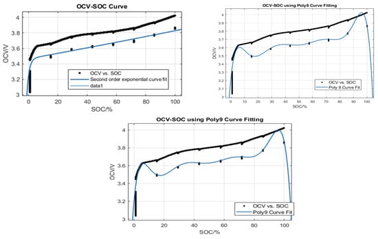 Equation (1) assumes a linear relationship between SOC and OCV, an assumption which may not always be accurate. In practice, battery management systems may use more sophisticated algorithms to estimate SOC based on a combination of factors, including OCV, current and voltage measurements, temperature, and other battery characteristics. Curve fitting is a method commonly used to obtain the relationship between the OCV and SOC of a battery. It involves fitting a mathematical model to a set of data points, which are obtained experimentally or through simulations. In this study, the OCV–SOC curve of a lithium-ion battery was modelled and fitted using exponential and polynomial functions in MATLAB-R2023a.