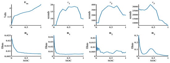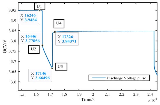 The values of are obtained from the relaxation time constants , , and of the pulse-discharge curve. The MATLAB simulink design optimization and curve-fitting toolbox are used for parameter estimation and for obtaining the OCV–SOC curve. Figure 3 shows the sample pulse-discharge voltage, with the data points showing the values of and .
