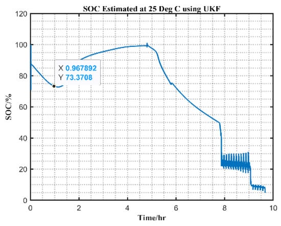 where is the rated capacity and is the battery current at time t. To estimate the capacity, the start SOC ( and the SOC at the ith charging instant (are considered. Figure 5 shows how to estimate the SOC using UKF for drive-cycle data recorded at 25 °C.