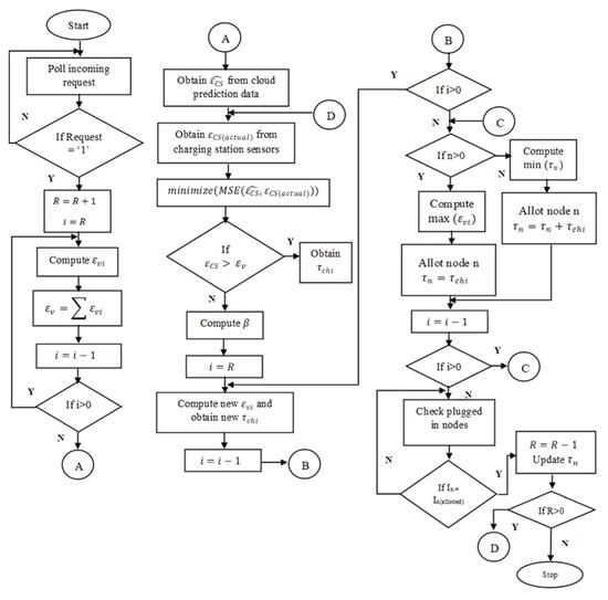 The user raises a request for charging through the developed mobile application by entering their EV’s unique ID. The algorithm polls for any incoming requests and keeps a count of the un-serviced requests. The SOCi, DODi, and are obtained from the BDT deployed in the cloud, using the user’s unique vehicle ID. The amount of energy required by the vehicle in order to charge it is then computed as in Equation (17).