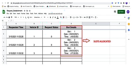 Slot details will be fetched from the Google Sheet, as shown in Figure 12, using the Python code running in a local machine; the local machine will then communicate with the Arduino through serial communication. This process involves establishing a connection between the Python script and the Arduino board to facilitate the exchange of data. For instance, the Python code can retrieve information such as slot numbers, availability status, and corresponding LED indicators from the Google Sheet.