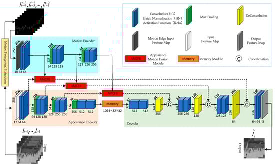 (1) We propose an appearance–motion dual encoder fusion approach, which extracts appearance and motion features separately and fuses them at the jump connection layer. This method aims to suppress the model’s prediction of abnormal behaviors and enhance the network’s generalization capabilities.