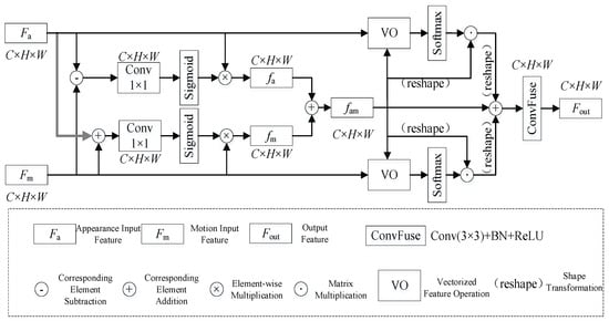 Vectorization feature operation of VO: The sum fusion feature family fam, consisting of fa and fm, is combined with the appearance input feature map Fa and the motion-specific feature Fm through a vectorization operation (VO). Then apply the Softmax function to each element individually. Transforming the family fam shape into a matrix of C × (H × W), and then multiplying it with the matrix following the previous Softmax operation. Ultimately, the matrix’s feature shape, which has a size of C × (H × W), is condensed into a feature graph of size C × H × W.