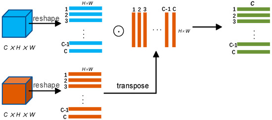 where and denote the vectorization features of Fa and Fm, respectively, and and represent interactive vectorization features. indicates the transposed characteristics of the vectorization features , and refers to the shape transformations. Vectorization feature operation VO is depicted in Figure 3: