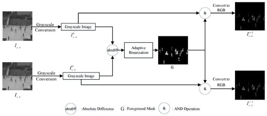 This difference is binarized to generate the foreground mask map G, which is accomplished through a binarization technique. The absolute value of its difference is binarized to obtain the foreground mask map G, where the binarization employs the method of adaptive binarization [], and then , , and G are summed to generate the grayscale map and and the motion foreground information. Finally, the grayscale map and and the motion foreground information are transformed into RGB maps to extract the foreground region information from the actual video frames and , respectively.