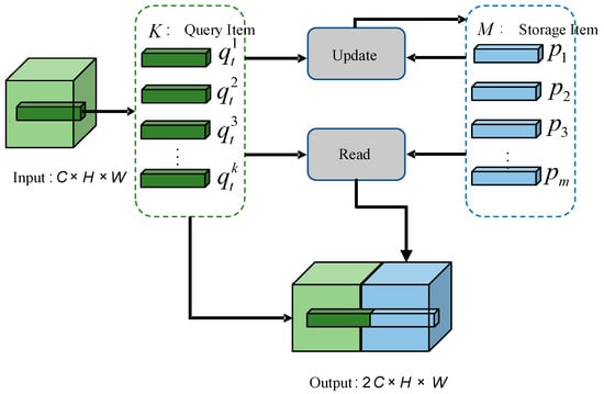 To enhance the diversity of normal patterns and mitigate the model’s ‘generalization’ power, Mem-U-net [] integrated a memory module at the deepest level of the encoder. This module is designed to capture potential features of normal behavior and restrict the model’s predictive generalization to only abnormal samples. As depicted in Figure 5, the memory module primarily consists of two operations: reading and updating. Firstly, the output feature map of the encoder is divided into K query terms () along the channel dimension, where , and the size of each query term is , and there are a total of M storage terms of size, which are utilized to document the potential characteristics of normal data. The read operation initially computes the cosine similarity between each query item and all stored items employing the Softmax function. Subsequently, this similarity is normalized to serve as the read weight corresponding to the respective query and stored items. The stored item is then retrieved by means of a weighted average using these weights. The update operation, conversely, computes the cosine similarity between each stored item and all query items, and normalizes it to serve as the corresponding update weight, thereby updating the features of the stored items, and achieving the memory function through the interplay of read and update operations.