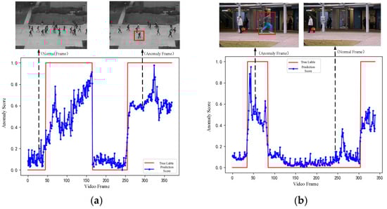 As illustrated in Figure 6a,b, the predicted scores for normal frames are notably low, whereas those for abnormal frames are comparatively high. Consequently, a threshold can effectively differentiate between real frames that are abnormal or not. The outlier scores for consecutive normal frames appear relatively consistent, whereas those for consecutive abnormal frames exhibit greater fluctuations. This is primarily due to abnormal behaviors, such as cycling and running, being obscured by normal activities.
