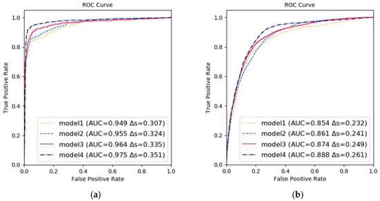 Figure 7 and Figure 8, respectively, illustrate the ROC curves and prediction error plots for the various networks listed in Table 2. The disparity between the average prediction scores for all normal frames and all abnormal frames on the UCSD Ped2 and CUHK Avenue datasets is presented below Δs in Figure 7a and Figure 7b, respectively, and Δs, and the the large the AUC, the better the model distinguishes between normal and abnormal frames.