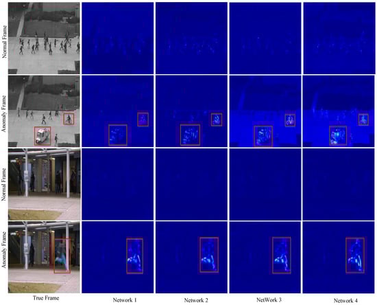 The first and second rows of Figure 8 depict the qualitative results of prediction error maps for the UCSD Ped2 dataset, while the third and fourth rows represent the corresponding results for the CUHK Avenue dataset. From Figure 8, it is evident that the integration of the memory module at the bottleneck stage enables the recording of prototype patterns of normal data. This constraint can effectively limit the prediction of abnormal behaviors during testing, thereby enhancing the model’s anomaly detection performance. The brightness of the abnormal behavior region is more pronounced in the AMFCFB module than in the one without AMFCFB, suggesting that the interactive fusion with appearance features can enhance the utilization of motion foreground information and strengthen the correlation between appearance and motion features. This, in turn, can further suppress the prediction of abnormal behaviors.