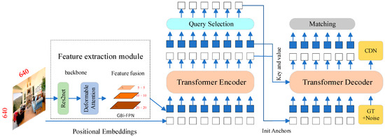 In recent years, the detection transformer (DETR) architecture based on the Transformer structure [31] has become a new paradigm for object detection. These models abandon performance-limiting handcrafted modules and rely on attention mechanisms to match queries with features, treating object detection as an end-to-end set prediction task. They adopt a hybrid structure of Transformer and neural networks, viewing object detection as a set prediction problem, decoupling the relationship between position and prediction, simplifying the entire object detecting procedure, eliminating operations such as NMS that affect detection performance, and demonstrating strong potential in tasks involving complex scales and dense objects due to their better global modeling capabilities. He et al. [32] separated cross-attention into two separate branches, initializing content queries in the decoder with a little detector, improving content queries in the early stages of training by predicting classification and regression embeddings, and introducing a pairwise self-attention mechanism in the decoder to consider spatially adjacent object query pairs and utilize their spatial context information. ZHANG et al. [33] proposed the DINO model based on Deformable DETR. DINO employs dynamic anchor boxes (DABs) and denoising training (DN) techniques, using deformable attention mechanisms to improve computational efficiency. By simultaneously presenting the model with positive samples (small noise) and negative samples (large noise) of the same real target, the model is helped to distinguish and avoid repeated detection of the same target. Combining the localization queries from the encoder output with learnable content-rich queries improves the initialization process of anchor boxes and uses refinement box information from subsequent layers to optimize the parameters of adjacent earlier layers, improving the accuracy of box prediction.