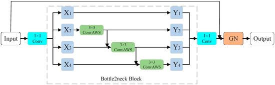 Res2Net is a multi-scale backbone network architecture first proposed by GAO et al. [34], originating from an improvement on the ResNet structure. Its multi-scale nature stems from multiple receptive fields at a finer granularity level, distinguishing it from methods that increase multi-scale by utilizing different resolutions. As illustrated in Figure 3, Res2Net divides the 3 × 3 filters in the original ResNet’s Bottleneck Block structure into n smaller filter groups, forming the Bottle2neck Block structure. It connects different filter groups using a residual block-like structure, allowing features extracted by each group to be passed on to the next, and finally concatenates all groups’ feature maps and sends them through a 1 × 1 filter for complete feature fusion. The combinatorial explosion effect generated by this structure enables the Res2Net architecture to include multi-scale receptive fields. Res2Net was chosen over other architectures like Efficient Net or Dense Net due to its superior ability to capture multi-scale features. Res2Net’s architecture, which employs a series of residual blocks with increasing depths and parallel branches, allows it to capture a richer set of features at various scales. This is particularly beneficial for indoor scenes where objects can vary significantly in size and complexity. Efficient Net, while efficient, focuses more on a balanced scaling of depth, width, and resolution, which may not be as effective for capturing the fine-grained details necessary for indoor object detection. Dense Net, with its dense connectivity pattern, can be computationally expensive and may suffer from diminishing returns in feature propagation, making it less suitable for our resource-constrained application. Depending on the number of layers, Res2Net has multiple structures. Without significantly increasing computational load while ensuring model depth, this paper selects Res2Net101 as the foundational model for the regression network. Due to the small batch size, Group normalization [35] is used to replace the original Batch normalization, and the existing convolution layer Conv is replaced with ConvAWS [36], thereby enhancing the network’s accuracy in indoor object recognition and reducing model computational overhead.