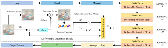 where is the query element’s two-dimensional reference point, is the location of sampling, m is the center of attention, and and are the attention weight and offset, respectively, of the k-th sampling point in the m-th attention head. The local perception capabilities of the network are improved by the offset and attention weight. Figure 4 tasks. step depicts the updated backbone network architecture.
