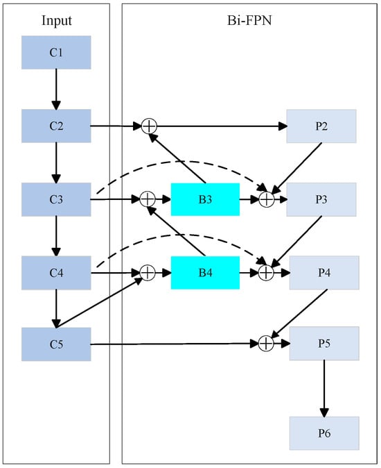 Two essential components of Bidirectional Feature Pyramid Network (Bi-FPN), a new network topology for computer vision tasks including object identification and semantic segmentation, are weighted feature map fusion and effective bidirectional cross-scale connections [38]. This means that Bi-FPN can effectively handle information interaction between features of different scales and perform effective fusion between different feature maps, thereby improving the model’s performance and efficiency. The bidirectional cross-scale connections are implemented through a top-down and bottom-up bidirectional pathway, ensuring that features across multiple scales can be fully integrated and propagated. During this process, Bi-FPN maintains the same feature resolution and adds lateral connections during upsampling and downsampling to effectively combine features of different scales without significantly increasing computational costs.