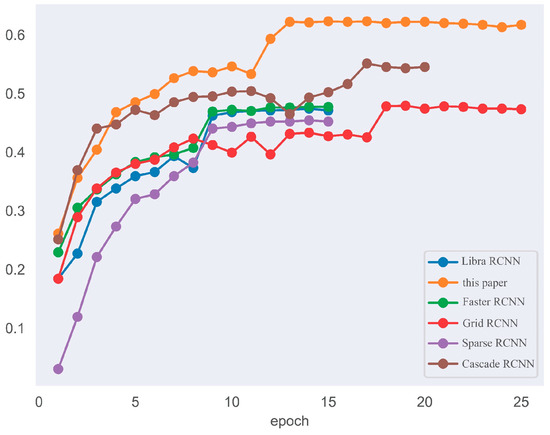First, we investigate the iterative and convergence effects of an indoor object detection model based on DINO on the Indoor-COCO dataset. Figure 6 illustrates the mAP values of different models during training using the training set. As shown, the performance of our model exhibits an upward trend throughout the training process. Due to the utilization of pre-trained weights, both the increase in mAP and the decrease in loss values slow down after the 13th epoch. The model achieves its optimal performance at the 15th epoch, after which it completes its convergence. Through comparisons with different models, our model demonstrates the best performance.