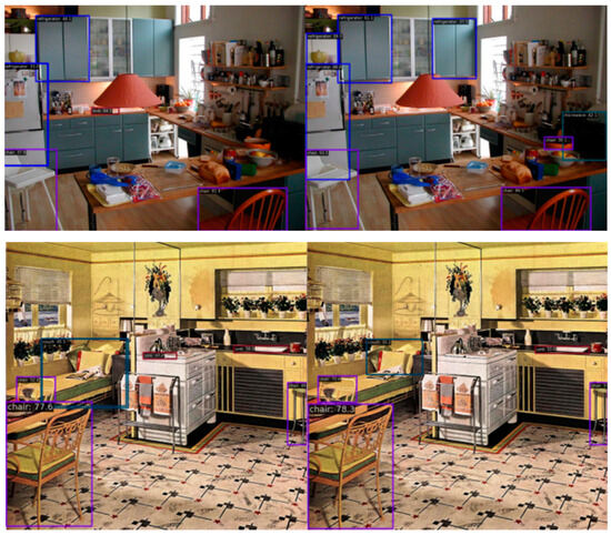 In addition to the successful detection cases mentioned above, it is also crucial to examine the limitations of our proposed method. One of the primary issues observed in our model is the misdetection or missed detection of objects due to severe occlusion. Figure 8 illustrates a scenario where a sofa is not detected due to significant obstruction by other furniture. The occlusion reduces the visibility of the sofa, causing the model to fail in recognizing its presence. The failure can be attributed to the occlusion preventing the model from extracting features of the couch effectively, leading to an inability to learn the feature representation of the occluded object. This highlights the necessity for further research into occlusion handling mechanisms, such as improved attention modules or occlusion-aware data augmentation techniques, to enhance the model’s robustness against occlusion.