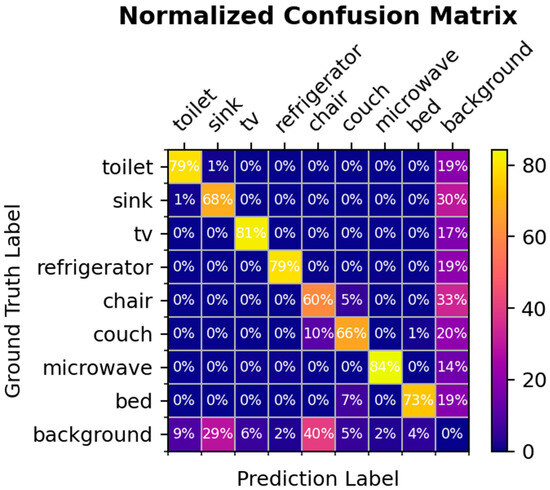 Additionally, Figure 9 presents the normalized confusion matrix for the classification rates of all indoor object categories by I-DINO. It can be seen from the confusion matrix that, as anticipated, I-DINO achieved the highest classification rates for the majority categories such as Toilet, TV, Refrigerator, and Microwave. Nevertheless, I-DINO also obtained commendable classification rates for the minority categories like Sink, Chair, Couch, and Bed. These results directly demonstrate the robust capability of the method in addressing the issue of class imbalance.