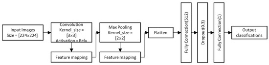 The convolutional neural network (CNN) is a classification tool that processes input images by convolving them with filters to extract features. This process involves several key layers, such as Conv2D, ReLU, MaxPooling, and fully connected layers, along with dropout layers to prevent overfitting during training. The convolutional layer convolves the original image with specific filters, typically followed by activation functions to introduce nonlinearity and batch normalization. MaxPooling layers are primarily employed to extract essential features, accelerate convergence, and reduce the size of the feature map [24,25]. The CNN used in this study includes four convolutional layers with a kernel size of 3 × 3. Each convolutional layer is followed by a MaxPooling layer with a pooling kernel size of 2 × 2 to reduce the feature dimensions. A flatten layer is placed after the last pooling layer to transform the two-dimensional feature map into a one-dimensional vector. Following the flatten layer, there are two fully connected layers: the first consists of 512 neurons with ReLU as the activation function, and the second is the output layer, containing one neuron with a sigmoid activation function to identify necrotizing fasciitis. Figure 1 illustrates the structure of the convolutional neural network used in this study.
