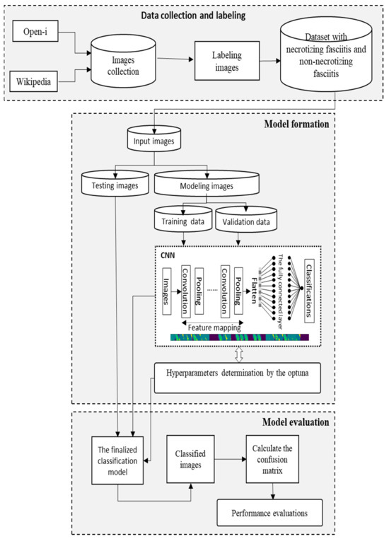 The aim of this study is to use image data and convolutional neural networks with Optuna to develop a detection system for necrotizing fasciitis. Figure 2 illustrates the designed CNNOPTDI model. The CNNOPTDI model consists of three stages: data collection and labeling, hyperparameter determination and model training, and testing of the finalized model. In the data collection stage, a dataset of 340 images, including 190 images with necrotizing fasciitis and 150 without, was gathered. In the second stage, the convolutional neural network, comprising convolutional layers, pooling layers, flattening layers, and fully connected layers, was trained using the data collected in the first stage. The data were separated into three parts, including 218 training data, 54 validation data, and 68 testing data. The training dataset was used to train the CNN models, with the hyperparameters tuned and determined by Optuna. The validation dataset was used to prevent overfitting during training. The model with the smallest validation error was selected as the finalized model. In the third stage, the testing dataset was utilized to evaluate the performance of the well-trained CNN model. The convolutional neural network with Optuna was employed to perform the classification tasks in the second and third stages.