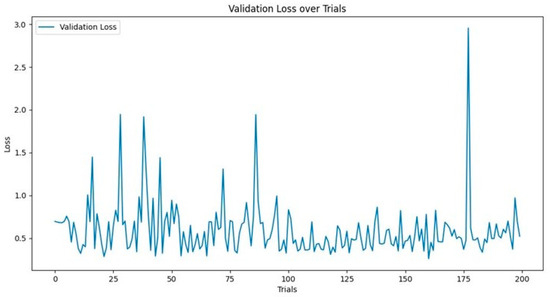 A validation dataset was used to prevent overfitting during the training process. The hyperparameters resulting in the smallest loss value served as the hyperparameters for the testing data. Figure 4 indicates the validation loss over 200 trials of the CNNOPTDI model. The loss function is expressed as Equation (12).