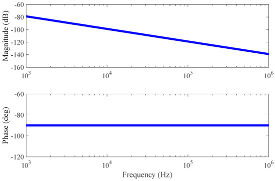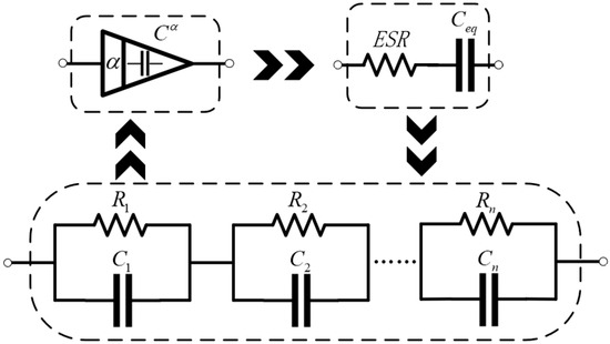 The fractional-order equivalent thermal impedance model in Figure 5 represents the nominal value of heat capacity in terms of . The fractional order is introduced to correct the heat capacity value , and . The relationship between the current and the voltage of an order- heat capacity can be governed by: