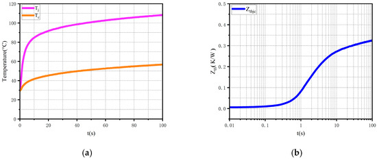 The measured junction temperature and case temperature of the DUT are shown in Figure 8a. Then, the junction–case thermal impedance curve of the DUT can be calculated according to Equation (2), as shown in Figure 8b.