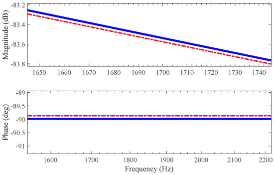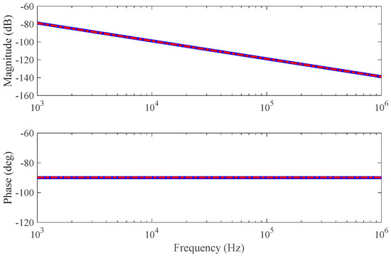 As shown in Figure 10, the variation curves of the amplitude and phase of the thermal impedance of the fractional-order equivalent thermal impedance model are compared with the amplitude frequency and phase frequency characteristic curves of the thermal impedance of the Foster thermal network model of the IGBT module of model Infineon FF75R12RT4. The blue solid line represents the amplitude frequency characteristic and phase frequency characteristic curves of the thermal impedance of the Foster thermal network model of the IGBT module with model number Infineon FF75R12RT4, and the red dotted line represents the variation curves of the amplitude and phase of the thermal impedance of the fractional-order equivalent thermal impedance model. In order to highlight the difference between two different results, Figure 10 is partially enlarged, as shown in Figure 11.