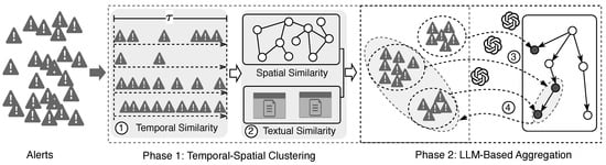 - Our Approach. To overcome the limitations of existing approaches, we propose a novel two-phase alert aggregation algorithm designed to fully exploit the temporal–spatial locality and cascading effects of service failures. Our approach is grounded in two key observations: (1) alerts triggered by the same root cause tend to occur close together in both time and space and (2) service failures often trigger cascading effects, where a failure in one service can lead to a chain reaction affecting multiple other services. By leveraging these insights, our method effectively groups alerts that are both temporally and spatially related and traces the cascading effects to refine the aggregation. Specifically, our algorithm begins with the coarse-grained temporal–spatial clustering of alerts, grouping those occurring within close time frames and refining clusters based on spatial and textual data. In the second phase, we use large language models (LLMs) to analyze cascading service failures. By mapping clusters from phase one onto a service dependency graph, the LLM traces the failure propagation across services, further aggregating alerts tied to the same root cause. This two-phase approach ensures the comprehensive and accurate aggregation of alerts, enhancing the ability of engineers to diagnose and resolve issues efficiently.