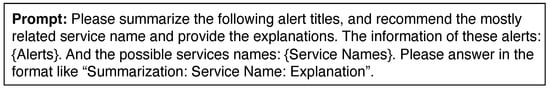 Algorithm. Given the clustering result obtained by Algorithm 1 and the service dependency graph , the system initializes an empty set to store the final aggregated clusters (line 1). The algorithm then iterates over each subset of clusters , where the alerts within are temporally and spatially similar (line 2). For each cluster , a summary of is generated and is mapped to its corresponding node in based on the summary by using the LLM (line 4–5). Next, it constructs , which is a subgraph of derived from the mapped nodes in line 5 (line 6). The algorithm then computes the weakly connected components within (line 7). According to Definition 6, the services within the weakly connected component exhibit high interdependency, implying that the alerts in the corresponding clusters may stem from a single root failure. Consequently, clusters whose corresponding nodes belong to the same weakly connected component are grouped together (line 8–12). Finally, the final aggregated clusters are returned in line 13. To conduct the alert summarization and node mapping in lines 4 and 5, we use the prompt in Figure 4.
