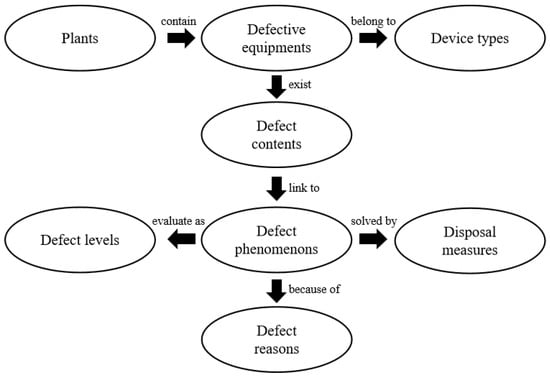 A schema consists of entity types and relationship types. Entity types define a class of data instances with a common structure, while relationship types describe the associations between entities. Common schema construction often involves merely listing entity and relationship types, which may not clearly reflect logical relationships. In this paper, we constructed the schema by using a logical flowchart, creating a corresponding domain knowledge system. We predefined eight entity labels: “plants”, “defective equipment”, “device types”, “defect contents”, “defect phenomena”, “disposal measures”, “defect levels”, and “defect reasons”. After that, we designed seven relationship types between two entity labels separately: “contain”, “belong to”, “exist”, “link to”, “evaluate as”, “solved by”, and “because of”. Then, we used these entity labels and relation types to construct the whole schema, as shown in Figure 1.