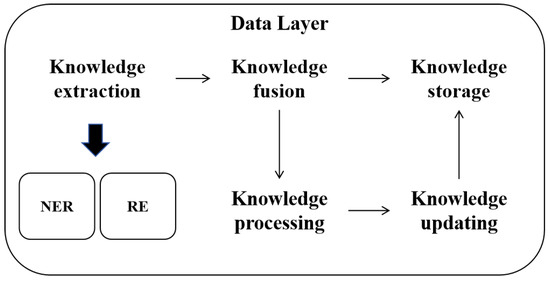 Meanwhile, we applied a bottom-up approach for the data layer of the KG, consisting of named entity recognition (NER), relation extraction (RE), knowledge fusion, knowledge processing, knowledge updating, and knowledge storage. NER and RE, collectively referred to as knowledge extraction, are foundational to building a knowledge graph. Knowledge fusion integrates knowledge from various sources to form a unified, consistent representation. Knowledge processing involves refining and enhancing raw data or existing knowledge to improve its quality, accuracy, and usability. Knowledge updating is a continuous process in managing and maintaining the knowledge graph to ensure the data remain current, accurate, and relevant. Knowledge storage involves storing the constructed knowledge graph in a database for subsequent processing and updates. The overall framework is illustrated in Figure 2.