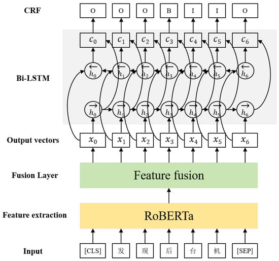 Considering the characteristics of automated defect text, we employed the RoBERTa-BiLSTM model for named entity recognition (NER) on automated equipment defect data. RoBERTa [24], developed by Facebook AI Research (FAIR), is a pretrained language representation model based on the BERT architecture. Compared with traditional BERT, RoBERTa more effectively captures contextual information and introduces a dynamic masking strategy where a random subset of tokens is selected for prediction in each iteration, improving the fixed masking mechanism of BERT. Bidirectional long short-term memory (Bi-LSTM) [25], a specialized recurrent neural network (RNN), combines LSTM units with bidirectional processing, providing robust representation capabilities to capture complex patterns in sequential data. In this model, RoBERTa is used for text feature extraction in the NER task, while Bi-LSTM is applied for sequence labeling. The overall architecture of the model is illustrated in Figure 3. In Figure 3, the sentence “发现后台机” represents the input sentence, which means “discovered backend machine” in English.