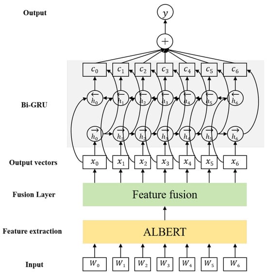 We employed ALBERT-BiGRU to address the relation extraction task. A Lite BERT (ALBERT) [27], developed by Google, was designed to reduce the number of parameters while maintaining or even enhancing performance. ALBERT reduces parameters through cross-layer sharing and proposes sentence order prediction (SOP), a new training method which replaces BERT’s next sentence prediction (NSP) and helps the model capture richer semantic information. Furthermore, with fewer parameters, ALBERT loads and runs faster, making it particularly suited for the computational environment in this study. The bidirectional gated recurrent unit (Bi-GRU) is a type of RNN which combines GRU mechanisms with bidirectional processing [28]. Compared with Bi-LSTM, Bi-GRU offers faster training speeds and fewer parameters, making it more appropriate for resource-constrained relation extraction tasks. We integrated ALBERT with Bi-GRU, following a similar approach to that used for NER. ALBERT serves as the feature extractor, while Bi-GRU handles sequence modeling, enhancing the features extracted by ALBERT to better capture the complex patterns between entities and their relationships. The model’s overall architecture is illustrated in Figure 4.