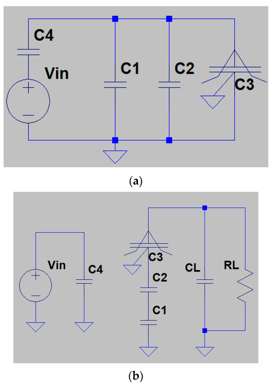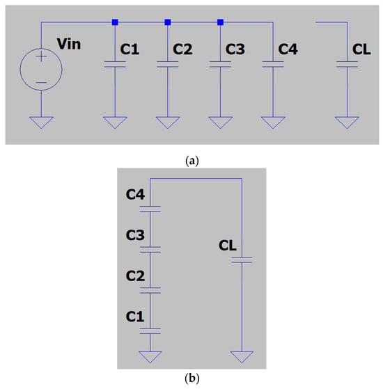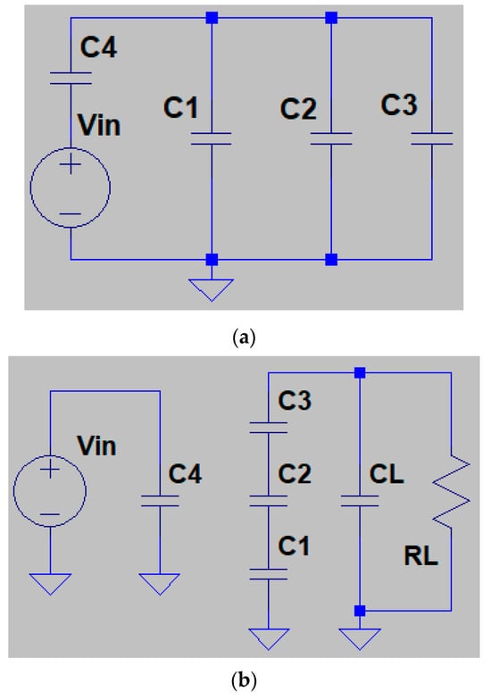 During the second phase, switches (SW5, SW6, SW8, SW9, and SW10) are ‘ON’ while others are ‘OFF’. The voltage source is connected in parallel with capacitor as in Figure 2b, so it can be recharged with , which makes in the case of no load. Other charge transfer capacitors , and , which are charged during the first phase with a voltage of , are connected in series to summit initial voltages across those capacitors and dump them to the load by parallel connection with filter capacitor .