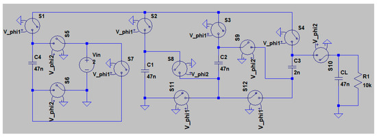 The novel topology shown in Figure 2 has two types of capacitors. The first type is known as charge transfer capacitors, which transfer charges from source to load through the control of switches. The second type is a filter capacitor, which is connected in parallel with the load to smooth and filter output voltage [7,8,9,10,11,12,13]. In addition to that, this topology has 12 switches that control the connection of capacitors to form converter phase one and phase two topologies.