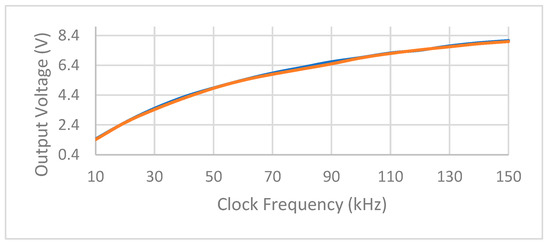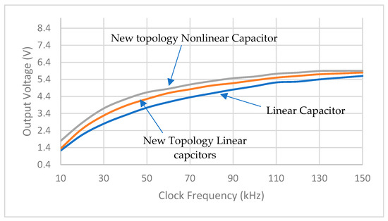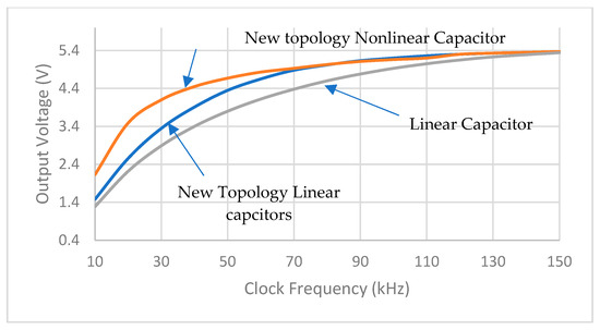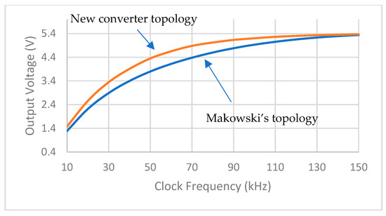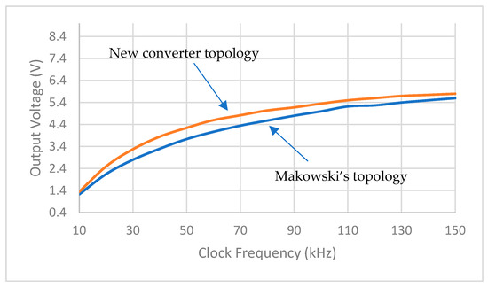 Figure 6 and Table 2 show the simulation results of output voltage vs. clock frequencies for both topologies of boost converters. The novel topology of boost converter has a higher conversion rate than Makowski’s topology using the same number and size of capacitors.