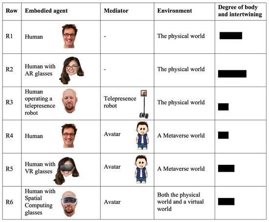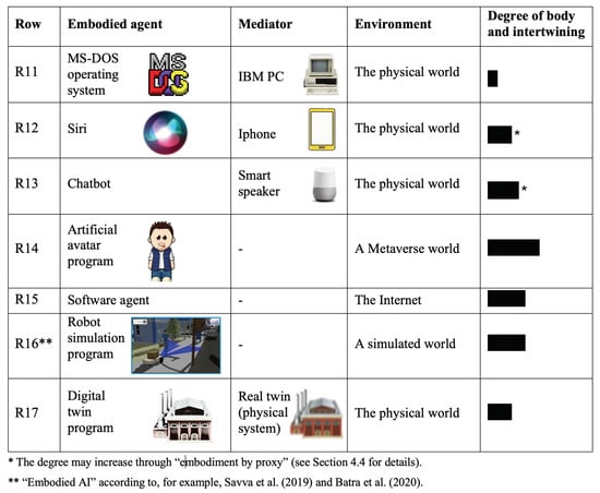 We introduced a five-dimensional taxonomy that helps categorize and understand various embodiment cases. The distinction between the embodied agent and the mediator (dimensions 1 and 2, respectively) may appear as a commitment to the Descartian mind–body dualism. According to this paradigm [3], a human was made up of an immaterial spirit inside a mechanical body. Thinking, willing, and conceiving were attributes of the spirit. The role of the physical body was to provide inputs passed from the sensory organs to the immaterial spirit, and to receive signals to activate muscles and enable motion. Our taxonomy certainly allows for human embodiment to be categorized as such, by regarding the soul as the agent (dimension 1) and the body as the mediator (dimension 2). However, R1 in Figure 1 illustrates the more recent embodied cognition paradigm wherein the entire human is regarded as an embodied agent. A dualistic approach is taken to describe teleoperation (R3), wherein the human is embodied as a telepresence robot, with the latter acting as a mediator. At R11, the operating system MS-DOS and the IBM PC are also described in a dualistic fashion. However, it would also be possible to regard the computer and operating system as one embodied agent, just as we describe the embodied human at R1. Hence, the taxonomy allows for both paradigms, and the choice is up to the user. We believe that this explicit option helps in understanding and discussing complex cases of embodiment.