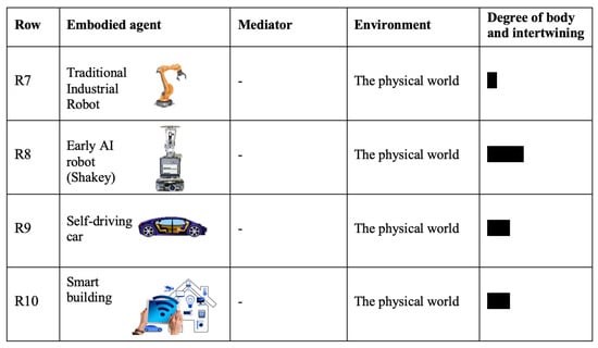 In the following subsections, we apply the proposed taxonomy to three types of embodied agents: humans, physical robots and other artifacts, and computer programs. This overview does not aim to be a review all possible cases of embodiment. The aim is rather to illustrate how the taxonomy is useful to characterize, compare, and distinguish between quite different cases of embodiment. Furthermore, the analyses of the nature of the embodiment cases often lead to insights that are novel contributions in their own right. In the text, we refer to rows R1–R17 in Figure 1, Figure 2 and Figure 3, with columns specifying the agent, the mediator, and the environment (the world where sensing and acting take place) for several of the described cases. For non-mediated embodiment, i.e., when the agent uses its own sensors and actuators, the mediator column is left blank. For mediated embodiment, the agent uses sensors and actuators belonging to the mediator, specified in the mediator column. The right-most column is a combination of the two dimensions degree of body and degree of intertwining. Since these concepts may vary a lot, even for a given category of embodiment, we indicate a bar of varying length, mainly to illustrate relative differences between categories (rows).