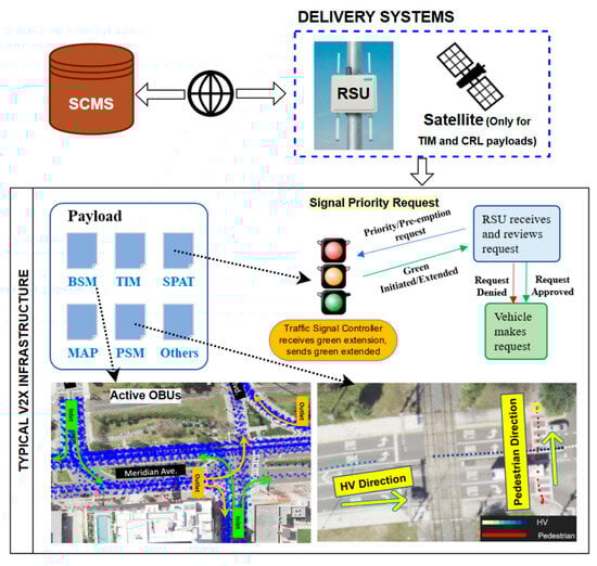 In the V2X system, the OBU broadcasts a Basic Safety Message (BSM) up to ten times per second, which provides the vehicle location, direction, and speed to nearby OBU-equipped vehicles and RSUs. RSUs typically communicate via Wireless Local Area Network (i.e., Dedicated Shortrange Communication (DSRC)) or Cellular network (i.e., Cellular Vehicle-to-Everything (C-V2X)) and serve a wide range of functions in addition to broadcasting BSMs and back-end data transfer, such as delivering high-frequency Signal Phase and Timing (SPaT), personal safety messages (PSMs), and intersection geometry (MAP) messages essential for numerous V2X mobility and safety applications [18,19]. They also support various informational services, including TIMs, which assist with traffic speed harmonization and overall situational awareness. Unlike RSUs, other forms of delivery, such as satellite communication, cannot support the low latency and high-frequency message exchange essential for certain safety applications [20]. However, satellite communication can be effective in the delivery of other critical security and informational messages, enhancing system resilience. Figure 1 provides an overview of each component’s role and the general structure of message exchange within the V2X environment.