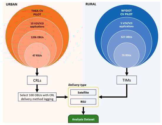 First, we use the THEA CV Pilot dataset to test the hypothesis of satellite technology being capable of timely delivery of CRL certificate when the OBUs are out of range of an RSU and compare the performance of satellite delivery when OBUs enter in range, i.e., the vehicles approach the urban area where the RSU infrastructure is installed. Second, we use the WYDOT CV Pilot data to analyze the performance of TIM delivery via RSUs coupled with augmented delivery via satellite dispatch. Figure 2 provides a methodological overview of the study, highlighting the various CV infrastructures implemented during the two pilot deployments.