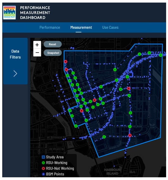 During the last two phases of the Pilot (Phase 3 and 4), an over-the-air firmware update was installed on a select pool of 100 aftermarket OBU devices to allow logging of CRL downloads. This provision, unique only to the THEA CV Pilot, allowed the testing and comparison of dispatching CRLs via satellite versus via RSUs. Figure 3 illustrates the layout of existing RSU infrastructure in downtown Tampa, highlighting the geofenced study area and system status indicators (i.e., real-time operational status of RSUs and spatial distribution of BSMs generated by OBU-equipped vehicles).