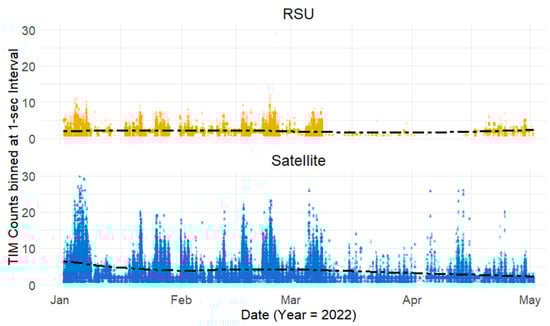 From 113,056 ITIS-encoded TIMS, 898,373 were readily delivered to road users. It is also observed that satellite delivery accounted for a much larger share of the total TIMs delivered (56.6% compared to RSUs 43.4%). To further establish a preliminary understanding of the rate of delivery of these encoded TIMs, we bin the dataset at 1 s intervals, as shown in Figure 5. This is performed to evaluate the number of TIMs delivered to end users in the shortest possible time from initial encoding, enabling greater situational awareness and prompt response to critical alerts. From Figure 6, it is visually evident that TIMs are delivered at consistently higher rates via satellite throughout the study period, with particularly elevated rates during the harsher winter months from January to March.